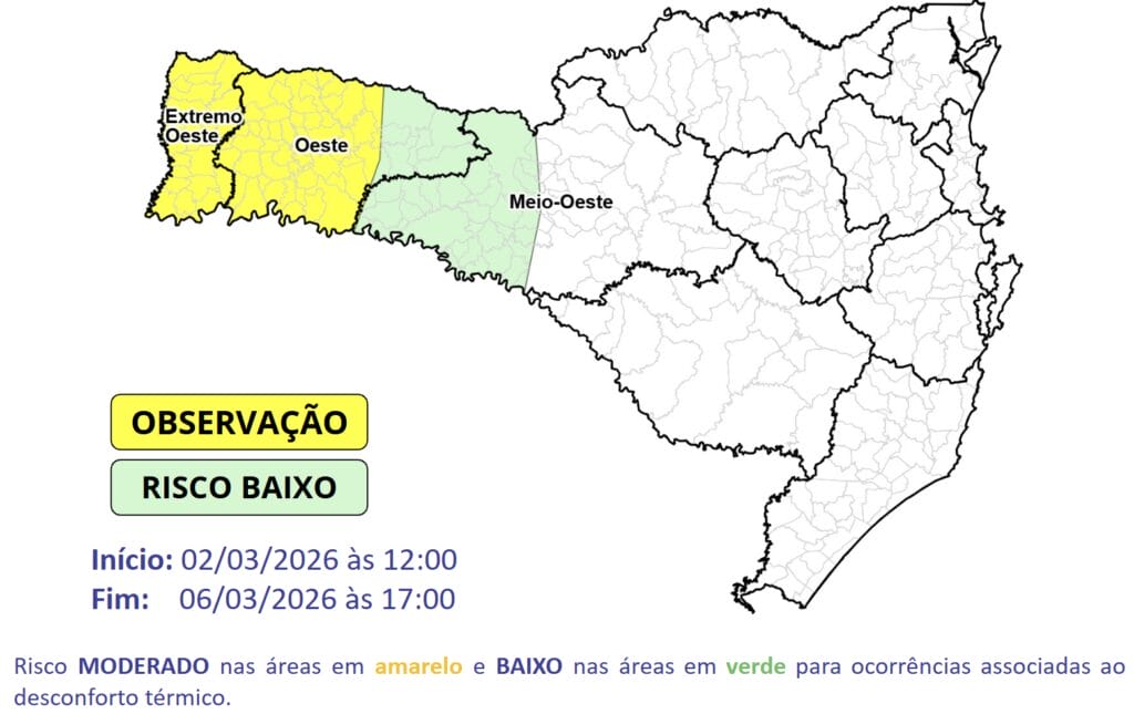 A Defesa Civil de Santa Catarina publicou, nesta segunda-feira (2), um aviso de observação para calor intenso, durante as tardes, até sexta-feira (6). As temperaturas máximas se aproximam dos 38°C no Oeste e Extremo Oeste. No restante do Estado, as máximas não ultrapassam os 30°C.
