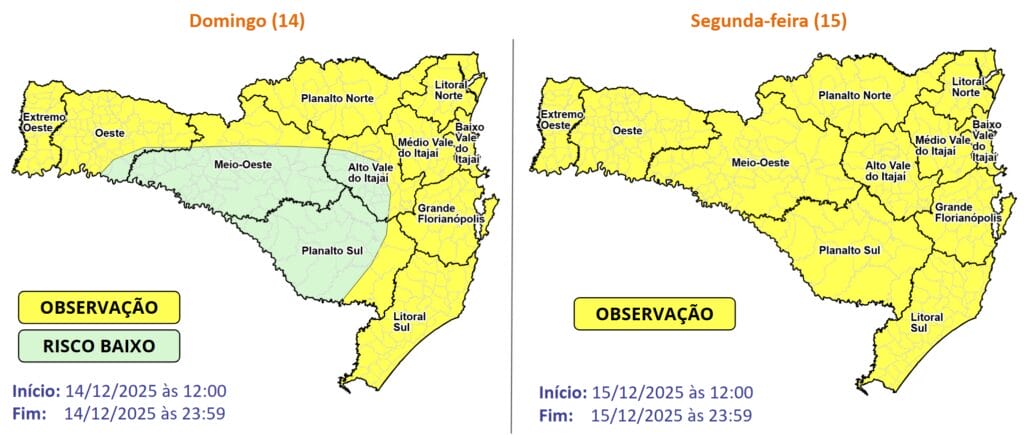 Já na segunda-feira, as temperaturas sobem ainda mais e passam dos 30°C em todas as regiões do Estado, podendo chegar até os 35°C em áreas do Litoral e Vale do Itajaí. Todo esse calor, somado ao aumento da umidade e a intensificação do centro de baixa pressão associado a frente fria, favorecem o desenvolvimento de temporais, acompanhados por raios, rajadas de vento, chuva pontualmente intensa e eventual queda de granizo.
