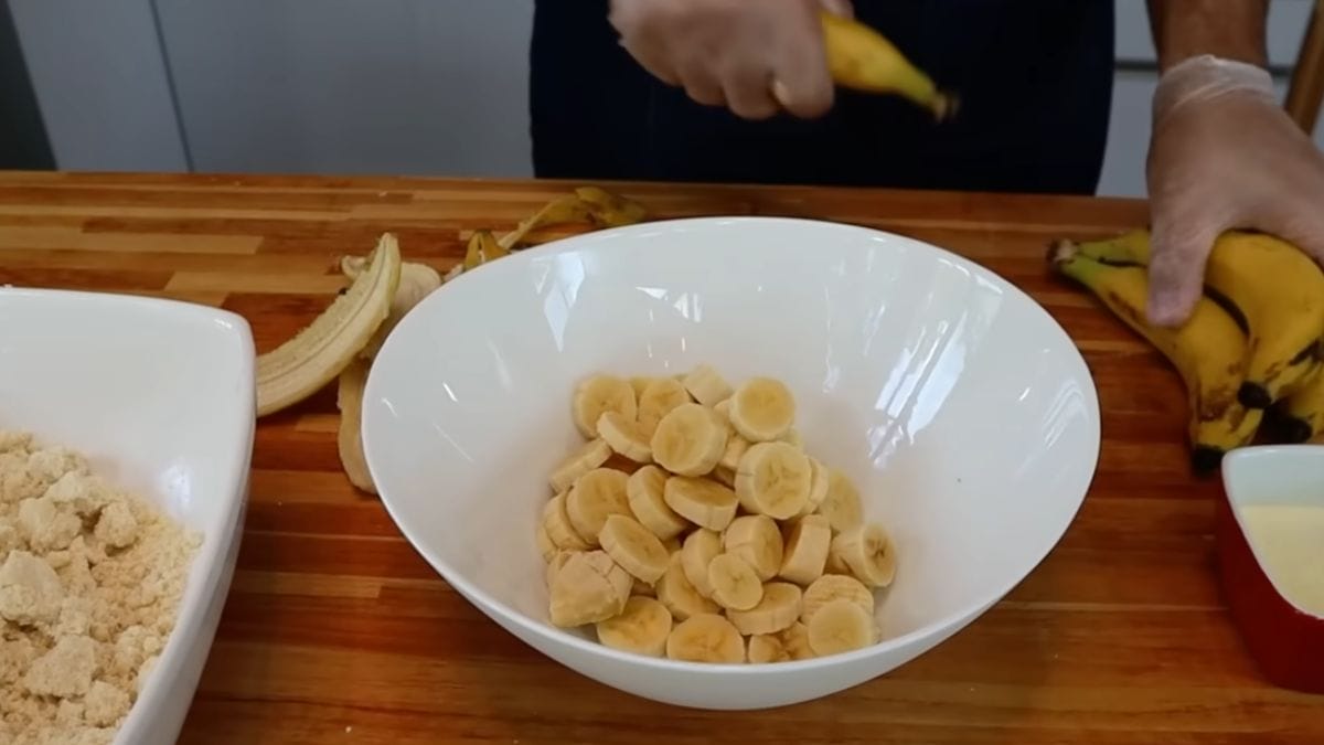 - Descasque as bananas e corte em rodelas e separe em um recipiente;