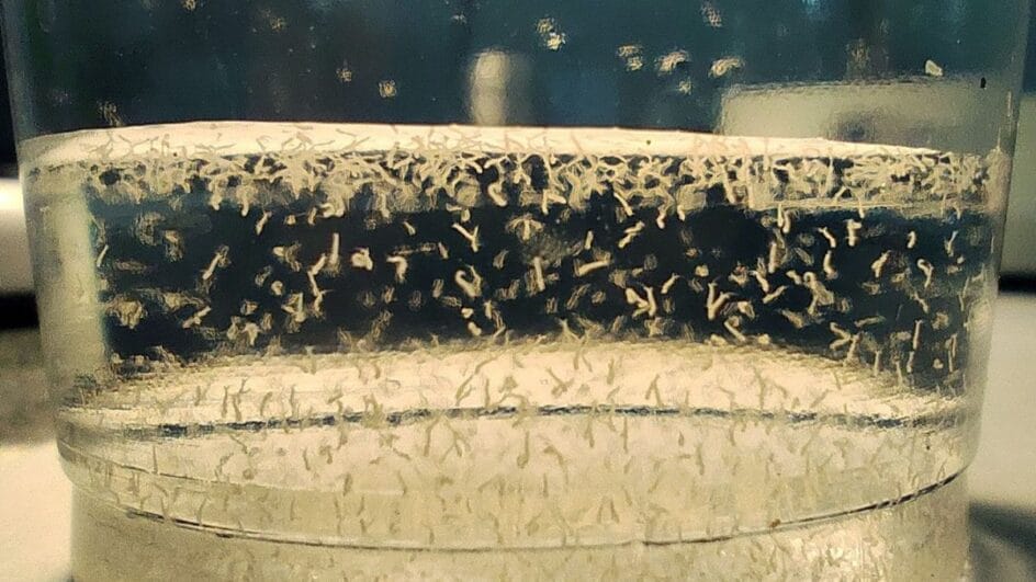 Na biofábrica catarinense, o processo inicia na sala de preparação, onde os ovos de Wolbitos são eclodidos em um equipamento automatizado. As larvas são transferidas para um segundo equipamento para serem contadas e divididas em grupos de sete mil.