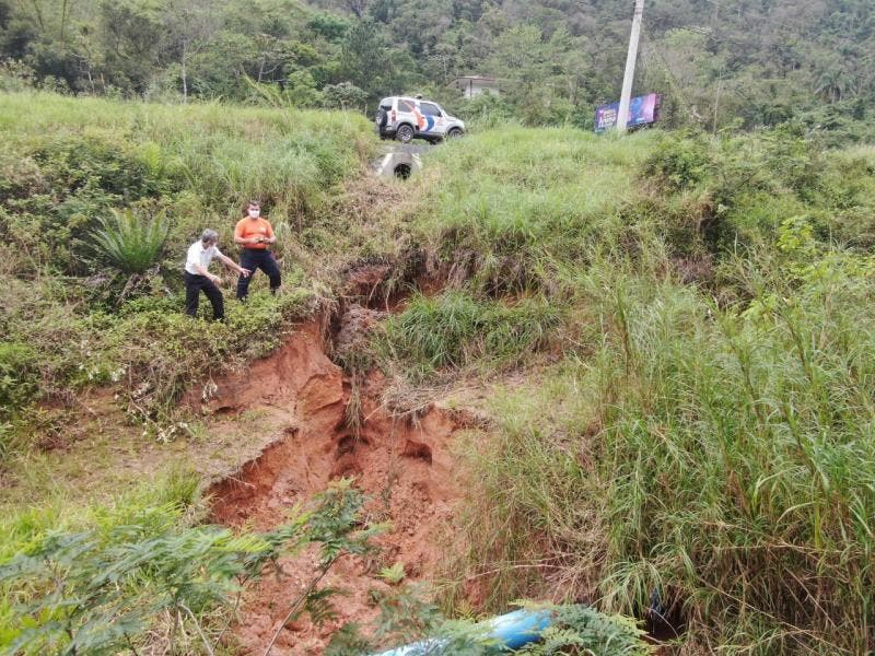 No local, os técnicos da Defesa Civil verificaram na última sexta (15) e nesta segunda (18) que a água sobre a rodovia, direcionada para a área verde das laterais, está causando os buracos e deixando à mostra uma tubulação de água de 300 mm.
