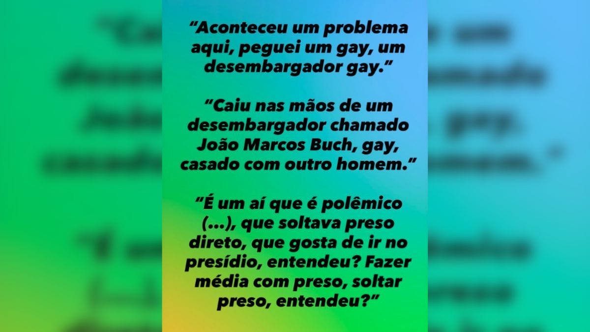 “A atuação como magistrado, em regra, sempre desagrada uma das partes, que sai perdedora no litígio. Isso resulta em recursos e, algumas vezes, em críticas dentro e fora dos autos “, afirmou Buch ao fazer a denúncia em sua rede social. Como divulgado por ele, um dos comentários vazados do grupo, escritos pelo advogado suspeito, descreve que “Aconteceu um problema aqui, peguei um gay, um desembargador gay”.