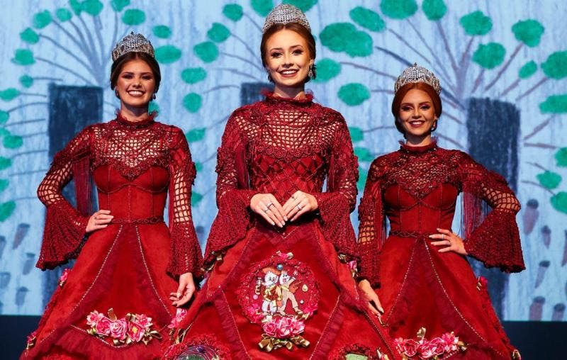 Além dos bordados, nesta edição da Festa do Pinhão, os vestidos da rainha Raíssa Freitas Wiggers, da primeira princesa, Natália Ribeiro Heineck, e da segunda princesa, Caroline Maria de Lima, têm veludo, crochê e macramê.
