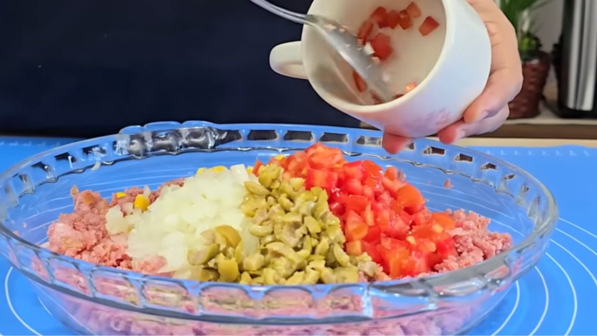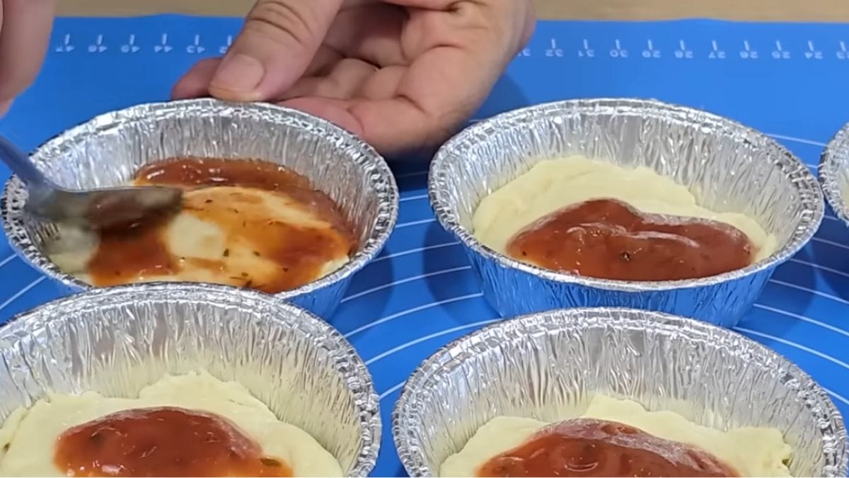 Em seguida, acrescente o molho de tomate por cima da massa e complete com os ingredientes que desejar. No vídeo, a cozinheira sugere misturar milho, calabresa, cebola, azeitonas e o tomate.