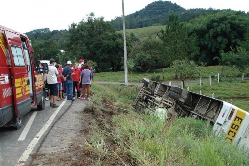 Um ônibus escolar da prefeitura de Taió saiu da pista e tombou às margens da rodovia SC-350. O acidente ocorreu às 11h45min desta quinta-feira, próximo ao trevo da Himasa. Dez pessoas foram encaminhadas ao Pronto Atendimento do Hospital Dona Lisette, em Taió, com ferimentos leves.
