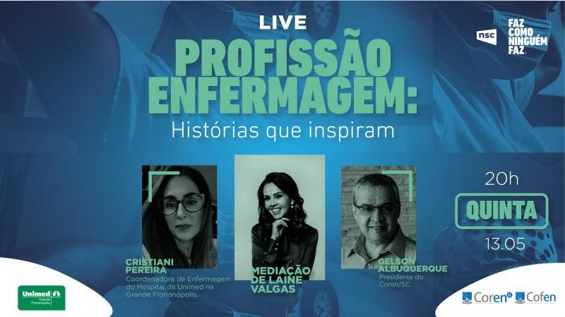 Em 12 de maio é comemorado o Dia Internacional da Enfermagem, área tão importante para a saúde e que, no último ano, mostrou-se ainda mais indispensável. Por isso, o NSC Total promoverá uma live para ampliar histórias inspiradoras em homenagem a esses trabalhadores nesta quinta-feira, 13 de maio, às 20 horas. Em um bate-papo transmitido pelo poral e pelo Facebook do NSC Total, a apresentadora Laine Valgas vai conversar com Gelson Albuquerque, presidente do Coren/SC e com Cristiani Marlene Pereira, coordenadora de enfermagem do hospital da Unimed na Grande Florianópolis.