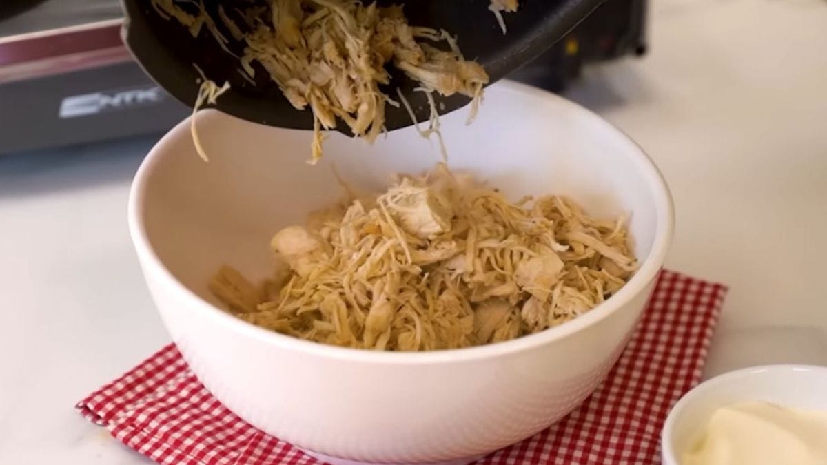 Após cozido, reserve a água do cozimento para outras preparações, como risotos ou feijão. Desfie o frango com a técnica de sacudir a panela.