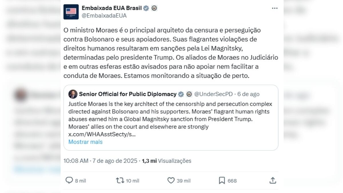A nota da embaixada americana foi divulgada na quinta-feira (7) e ameaçava os aliados do ministro Alexandre de Moraes, sancionado pelos EUA com a Lei Magnitsky, que pune cidadãos estrangeiros acusados de violações graves de direitos humanos ou corrupção.