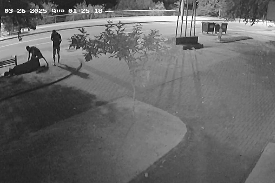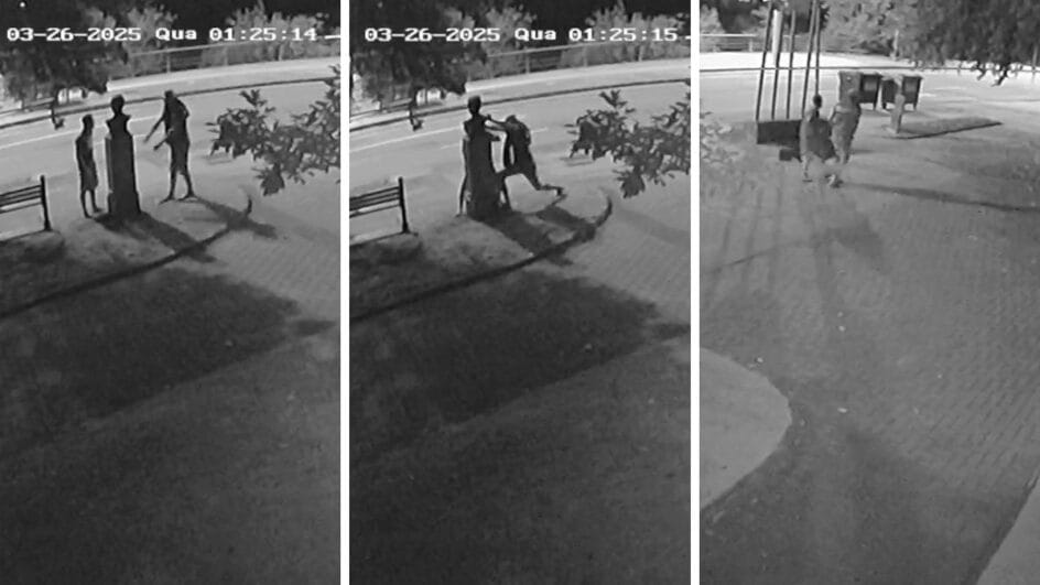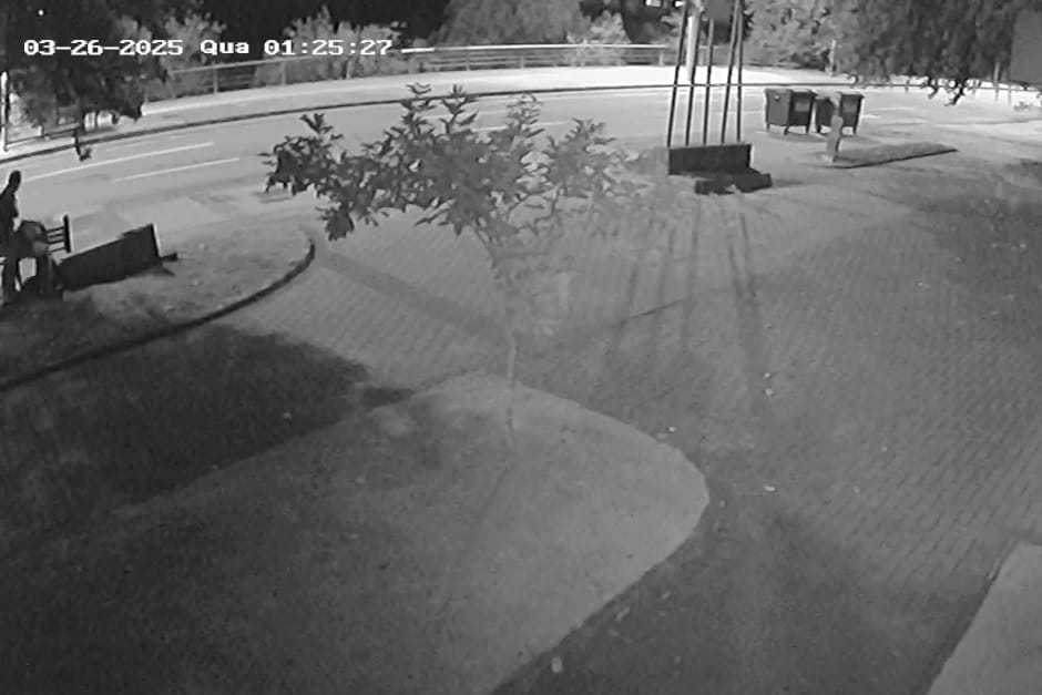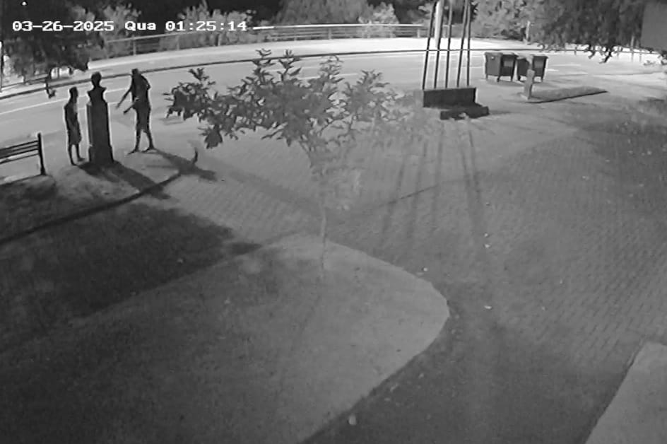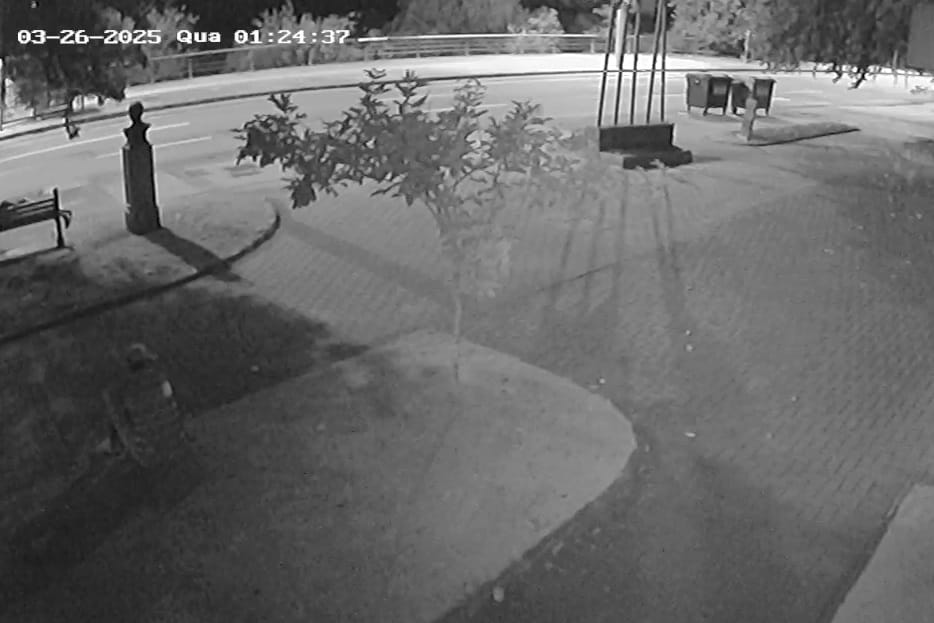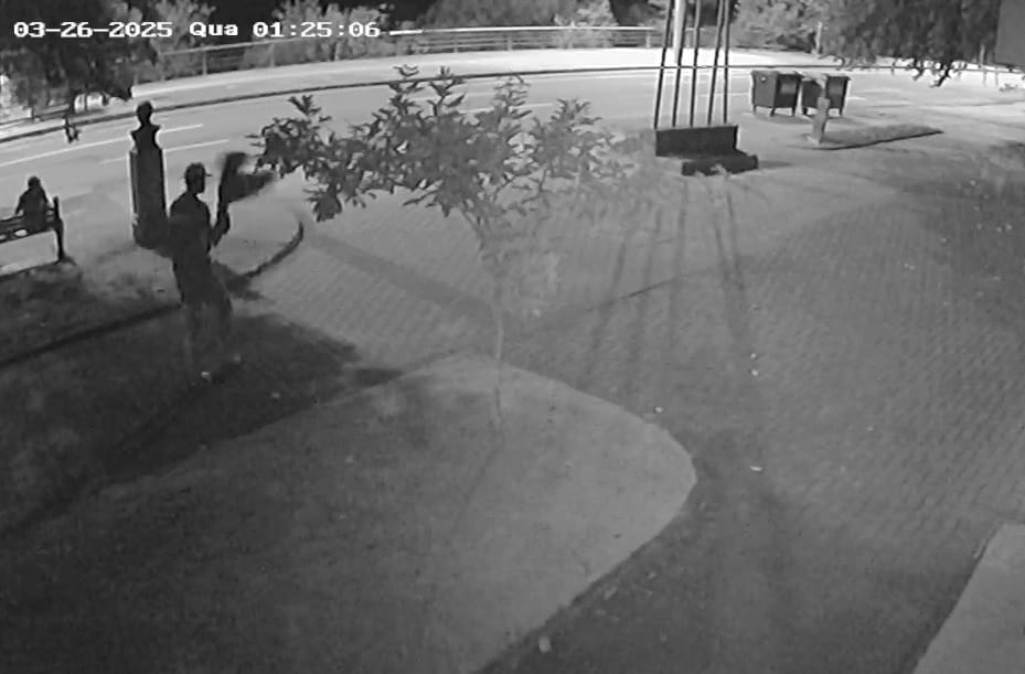 Um vídeo de câmeras de segurança mostra em detalhes como foi a ação dos criminosos que destruíram e furtaram um monumento em homenagem a Olavo Bilac em pleno Centro de Blumenau. As imagens revelam que a dupla começou a ação pontualmente à 1h25min da madrugada de quinta-feira (27). Eles estavam disfarçados ao lado da estátua. Um deitado em um banco e o outro sentado de frente para a Avenida Beira-Rio (confira nas imagens abaixo).
