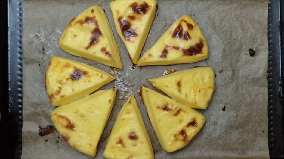 Depois de firme, desenforme cuidadosamente, corte em 8 pedaços e coloque-os em uma assadeira forrada com papel manteiga. Pincele o topo e as laterais com a gema extra e leve ao forno preaquecido a 180 °C por aproximadamente 30 minutos, ou até que os pedaços estejam bem dourados por fora. Sirva morno ou frio.