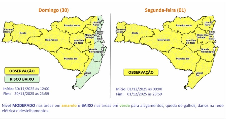 O alerta foi feito pela Defesa Civil. Conforme os meteorologistas da instituição, entre esse domingo e segunda-feira (1º) o tempo volta a ficar instável, com condições para “temporais acompanhados por raios, rajadas de vento, chuva pontualmente intensa e eventual queda de granizo”. O risco é moderado para ocorrências associadas a destelhamentos, quedas de galhos e árvores, danos na rede elétrica, alagamentos e enxurrada.