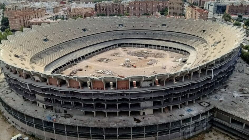 Inicialmente, o planejamento do Valencia era de construir um dos estádios “mais modernos do mundo”. No entanto, o gigante se tornou um “fantasma” desde 2009, quando as obras foram paralisadas.