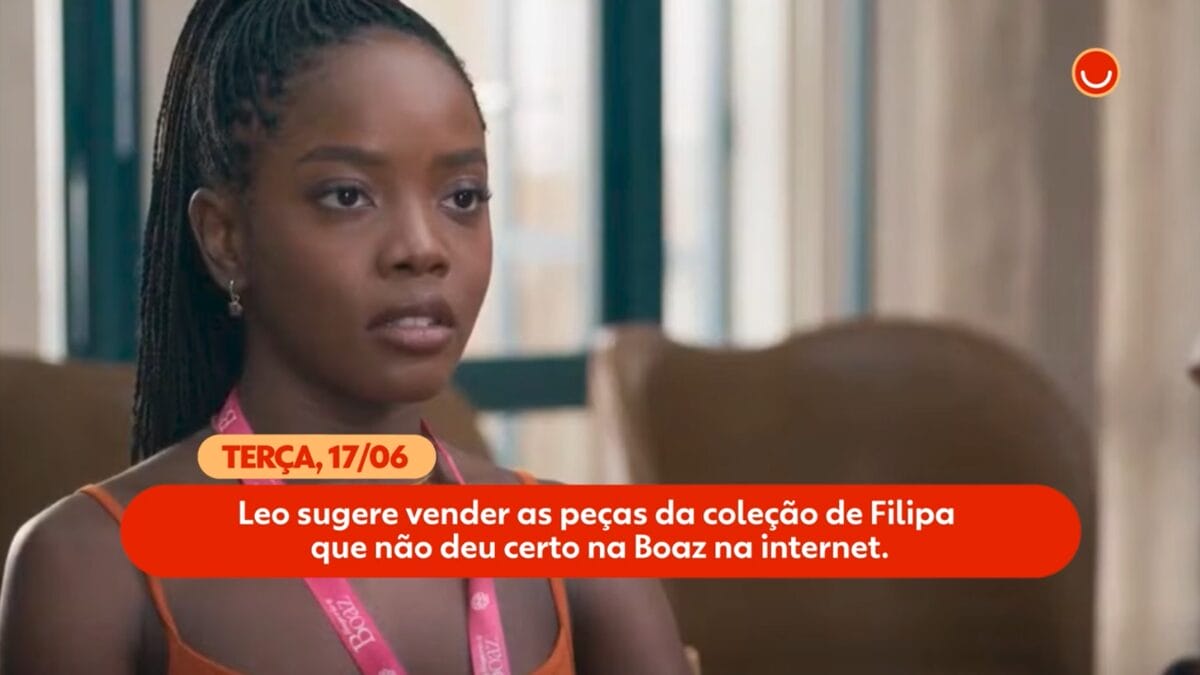 Leo vai com Sofia para o hospital. Vanderson revela a Jaques que Tânia esteve com Ricardo. Samuel fica encantado com o portfólio de Leo e suas ideias para a coleção de Filipa. Abel sente falta de Filipa. Dara pensa em assinar o contrato com Donzy, e Jussara se preocupa. Filipa se emociona ao ver o portfólio de Leo. Sofia diz a Filipa que Abel sente sua falta. Leo sugere vender as peças de Filipa na internet. Abel observa Vanderson. Rosa tenta falar com Abel para que ele encontre Filipa.