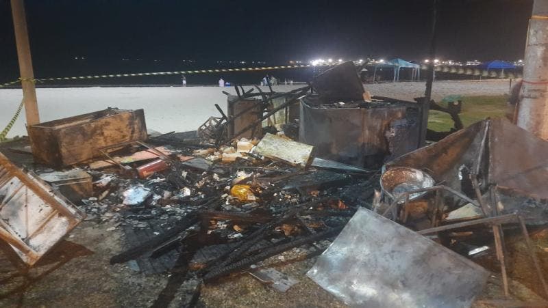 Imagens que circulam nas redes sociais mostram o quiosque sendo consumido pelas chamas. Ele ficava ao lado de um posto de guarda vidas, dos Bombeiros Militares. Veja: