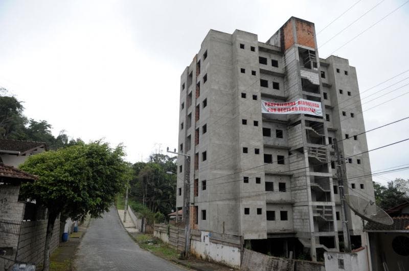 Um dos empreendimentos que o homem teria usado para aplicar os golpes fica no bairro Badenfurt, em Blumenau. Apesar da obra mais avançada, ainda está longe de ser concluída — algo que se repete nas demais construções. Uma faixa foi colocada há alguns meses no prédio sinalizando a interdição judicial.