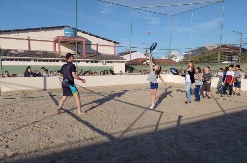 Além das quadras, os alunos receberam as raquetes para os jogos e participaram de atividades práticas com o professor Daniel para aprender a modalidade. Ele ainda falou sobre as melhorias na saúde que podem ser proporcionadas pela prática de beach tennis.