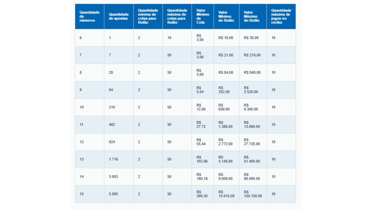 “É permitida a realização de no máximo dez apostas por bolão. Em caso de bolão com mais de uma aposta, todas elas deverão conter a mesma quantidade de números de prognósticos”, explica a Caixa.