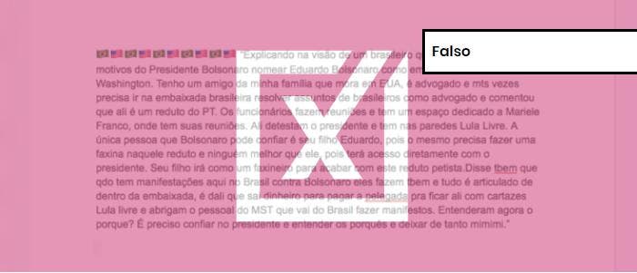 Segundo o texto, o presidente Jair Bolsonaro teria escolhido o filho Eduardo Bolsonaro, deputado federal pelo PSL de São Paulo, para ser o novo embaixador em Washington para que ele "faxinasse" o órgão. A corrente faz acusações sobre as quais não há evidências em outras fontes de informação.