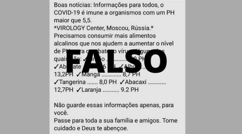 É falsa a mensagem que circula nas redes sociais sobre os alimentos "alcalinos" que supostamente preveniriam a contaminação por coronavírus. A imagem que chegou até os internautas catarinenses nesta semana afirma que um suposto virologista de Moscou, na Rússia, teria recomendado reforçar a dieta com alguns alimentos como, manga, limão e abacaxi, para criar imunidade contra o Covid-19.