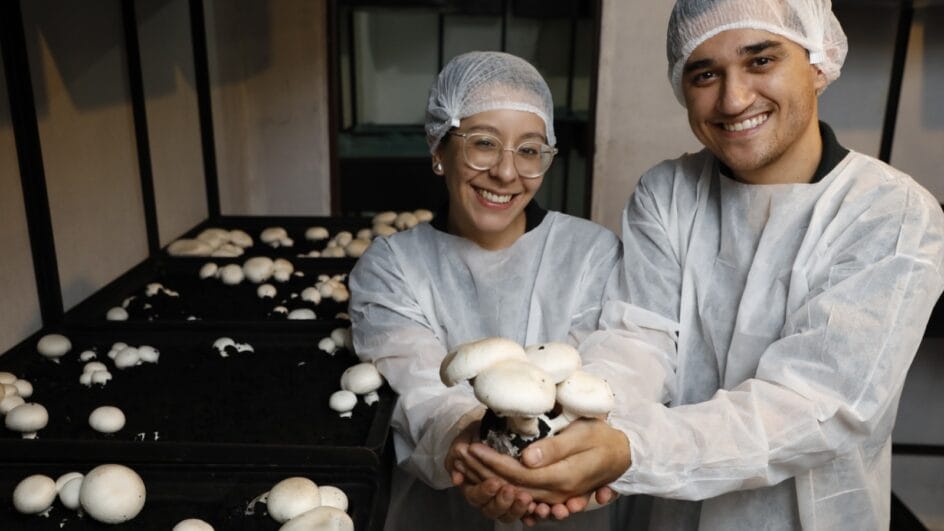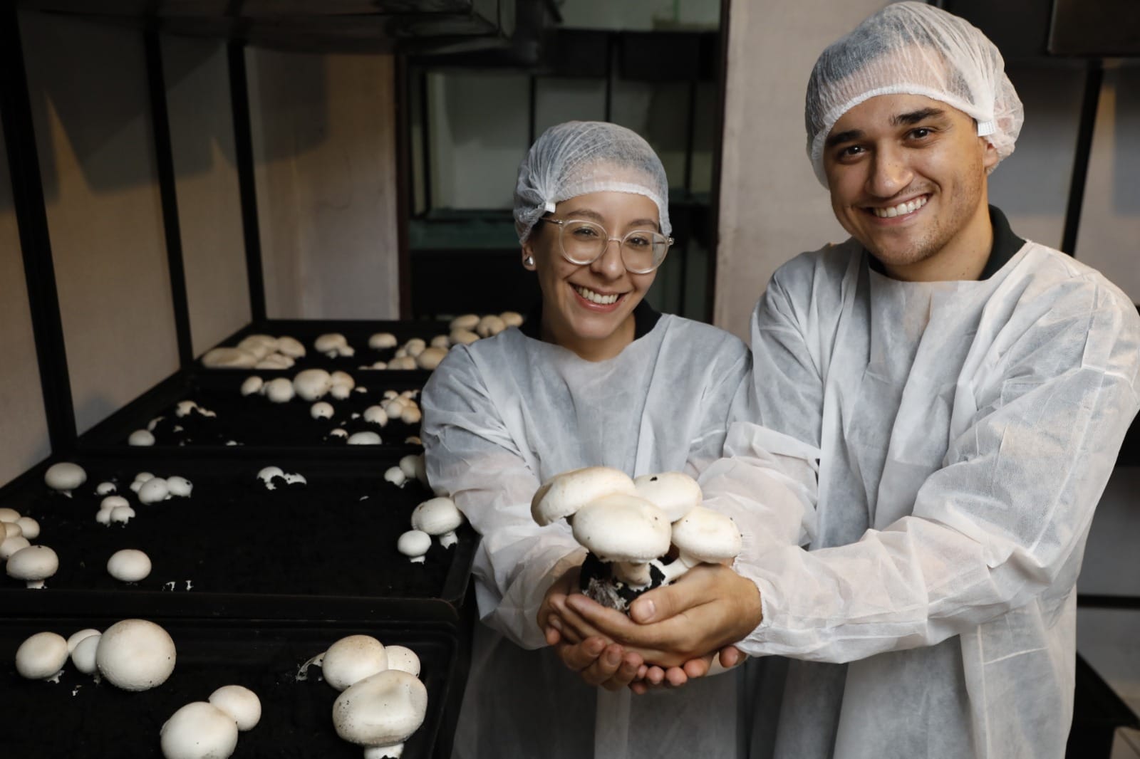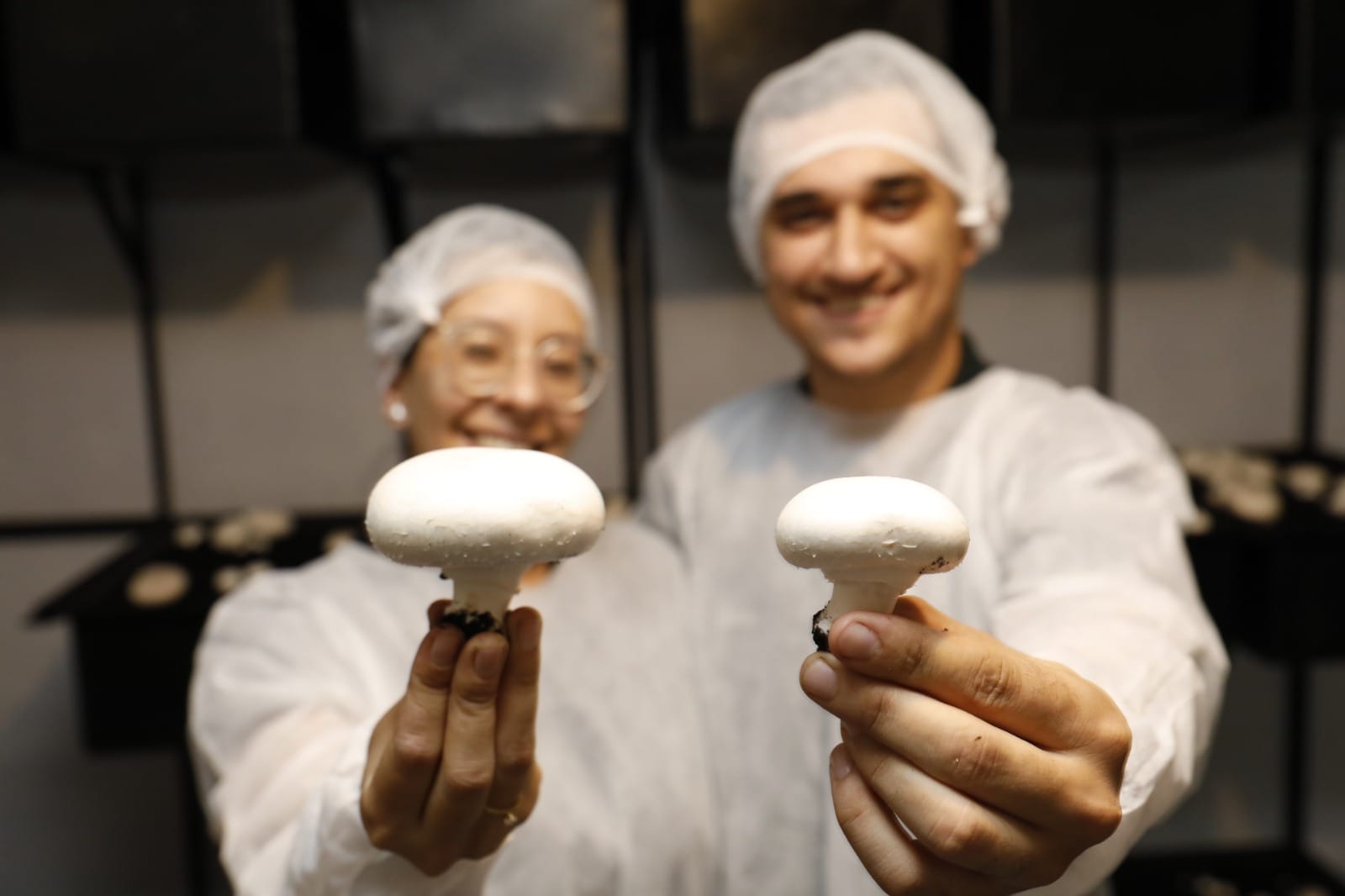 Caixas de leite guardadas pelos parentes ajudaram Daniel Burg e Isabelle da Luz a dar início ao sonho de viver da agricultura. Moradores de Brusque, uma cidade referência no setor têxtil, eles não tinham espaço e nem clima adequado para uma plantação. Então, decidiram usar a criatividade para começar uma criação de cogumelos. O que surgiu meio no improviso deu certo, ganhou apoio e hoje chega a dezenas de mesas.