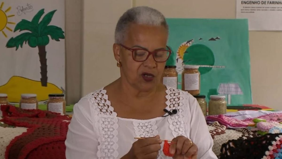 Aprendeu observando uma vizinha e nunca mais deixou a agulha de lado. “Eu faço blusa, vestido, colcha, tapete, caminho de mesa, pano de prato… Foi indo, foi se espalhando, e hoje eu vendo bastante”, conta.