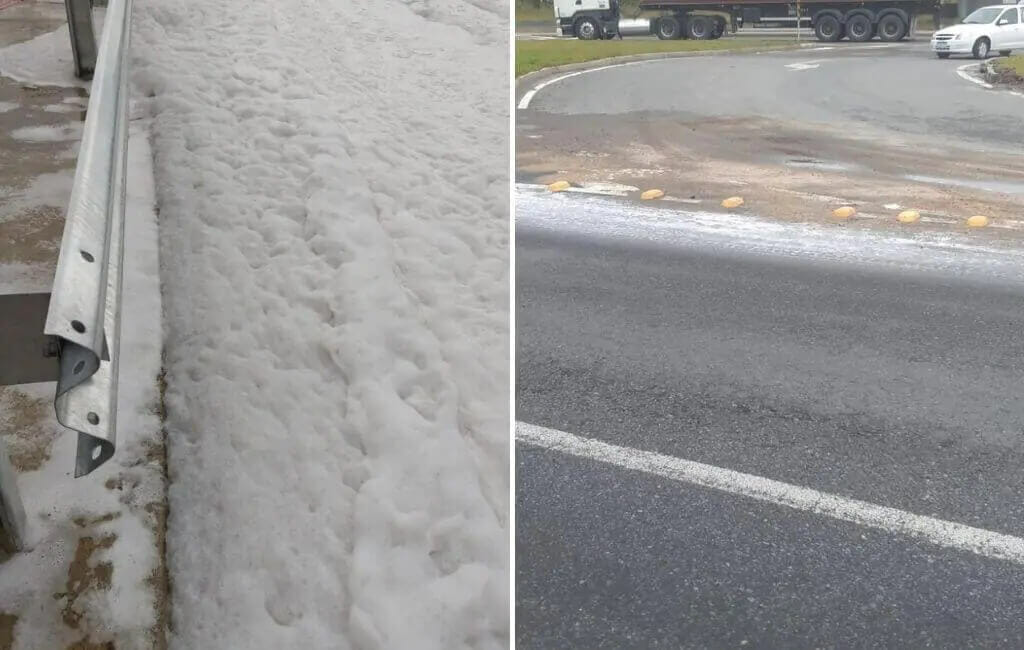 Com a chuva que caiu no mesmo dia, houve a reação do produto e a formação da camada branca pela rodovia.