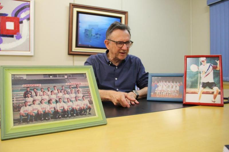 “Esse gosto pelo esporte nasceu com a família. Meus avós jogavam bocha e bolão. Meu pai jogava futebol em Encantado, mas não era profissional, era peladeiro. Quando eu cheguei em Chapecó, com seis anos, a cidade tinha umas 4,5 mil pessoas. Como todo menino eu jogava bola com os amigos. Cresci sempre gostando de esporte, futebol, tênis, basquete, futsal. No Ginásio São Francisco fazia parte de um grupo de alunos ajudou a buscar os tijolos para fazer a primeira quadra. Também ajudamos a colocar grama no primeiro campo. Íamos jogar tênis no Atlético Clube Chapecó numa quadra de cimento.”