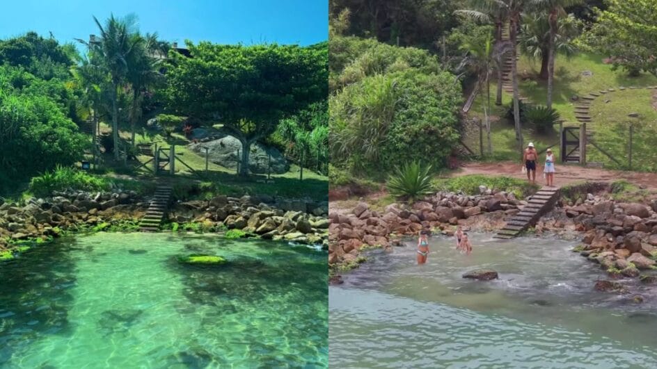 Discreta, pequena e cercada por memórias da comunidade, uma escadinha revela um destino paradisíaco em Garopaba, no Sul de Santa Catarina. Escondida atrás de residências na Rua Lajeado, o acesso se dá por uma trilha curta que começa nas proximidades da Praia da Preguiça.
