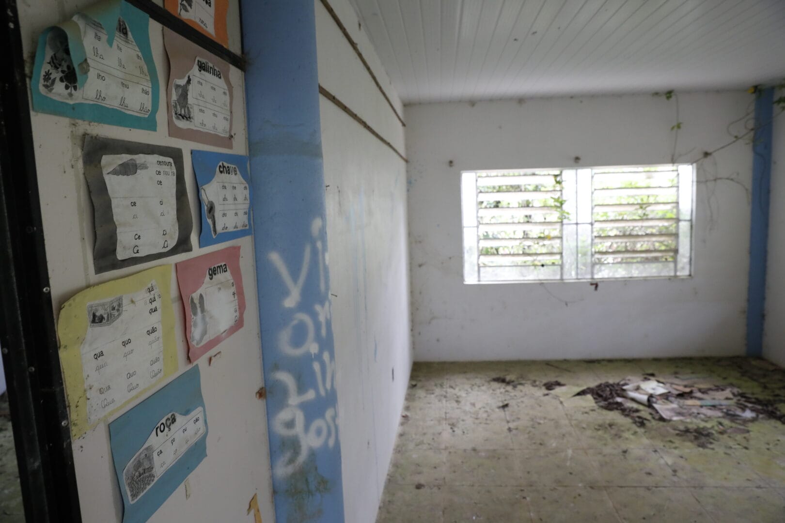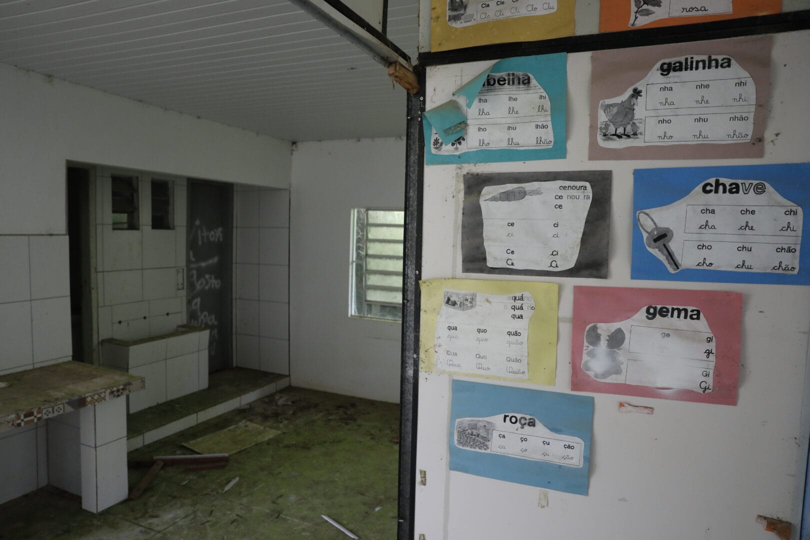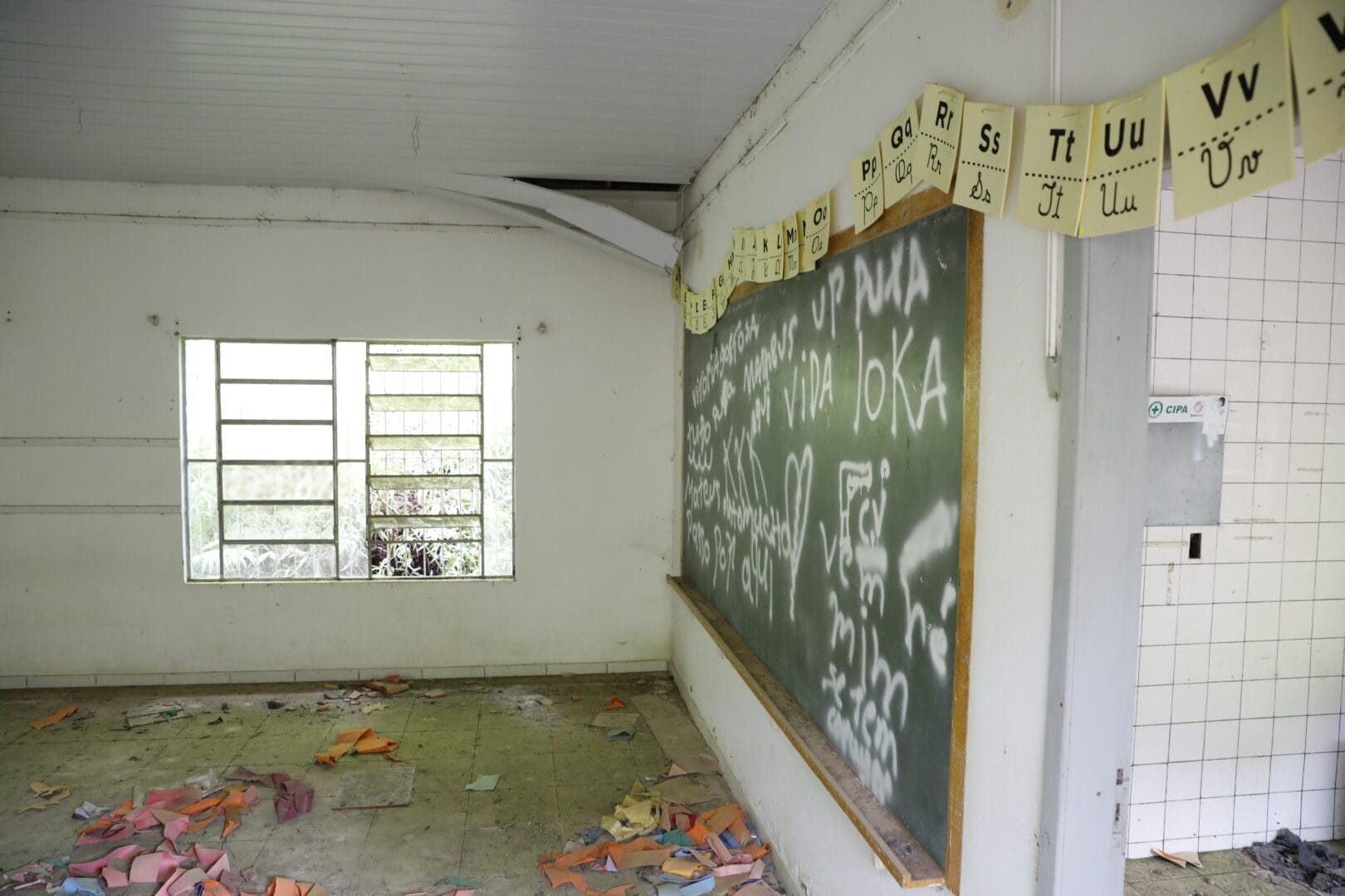 No fim da Rua Franz Muller, no bairro Velha Grande, está o espaço que um dia abrigou a escola Orestes Guimarães. O mato cresce desenfreadamente em volta. Lá dentro, o quadro, ainda da época do giz, segue na parede. Pendurados também estão os barbantes com as letras do alfabeto, os papéis ensinando a formação de sílabas. Uma história que ficou para trás.