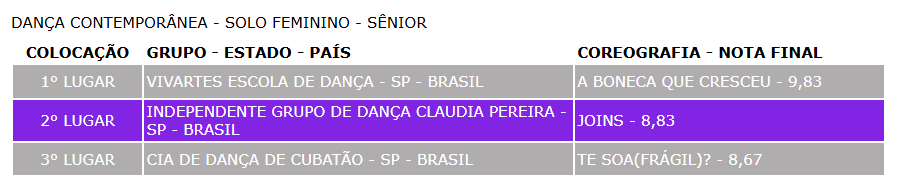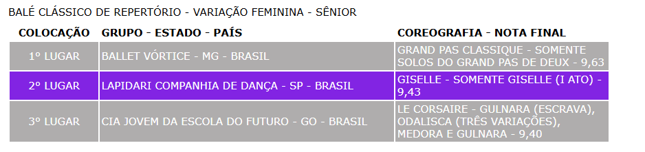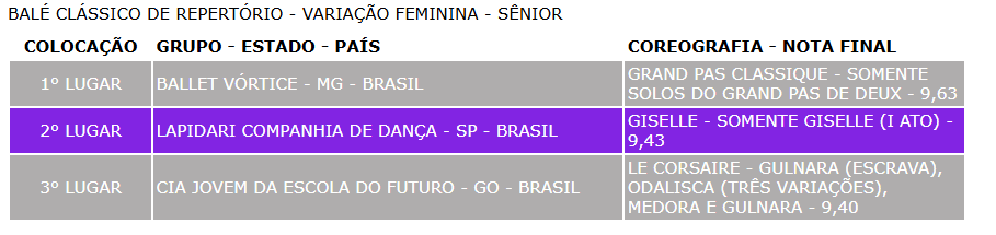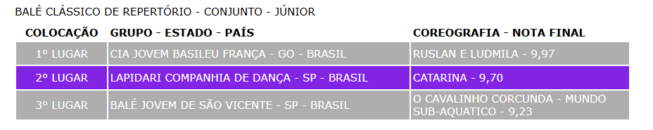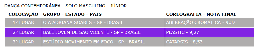 Os dançarinos se apresentaram nas categorias Dança Contemporânea (Conjunto Júnior, Solo Masculino Júnior e Solo Feminino Sênio) e Balé Clássico de Repertório (Conjunto Júnior e Variação Feminina Sênior).