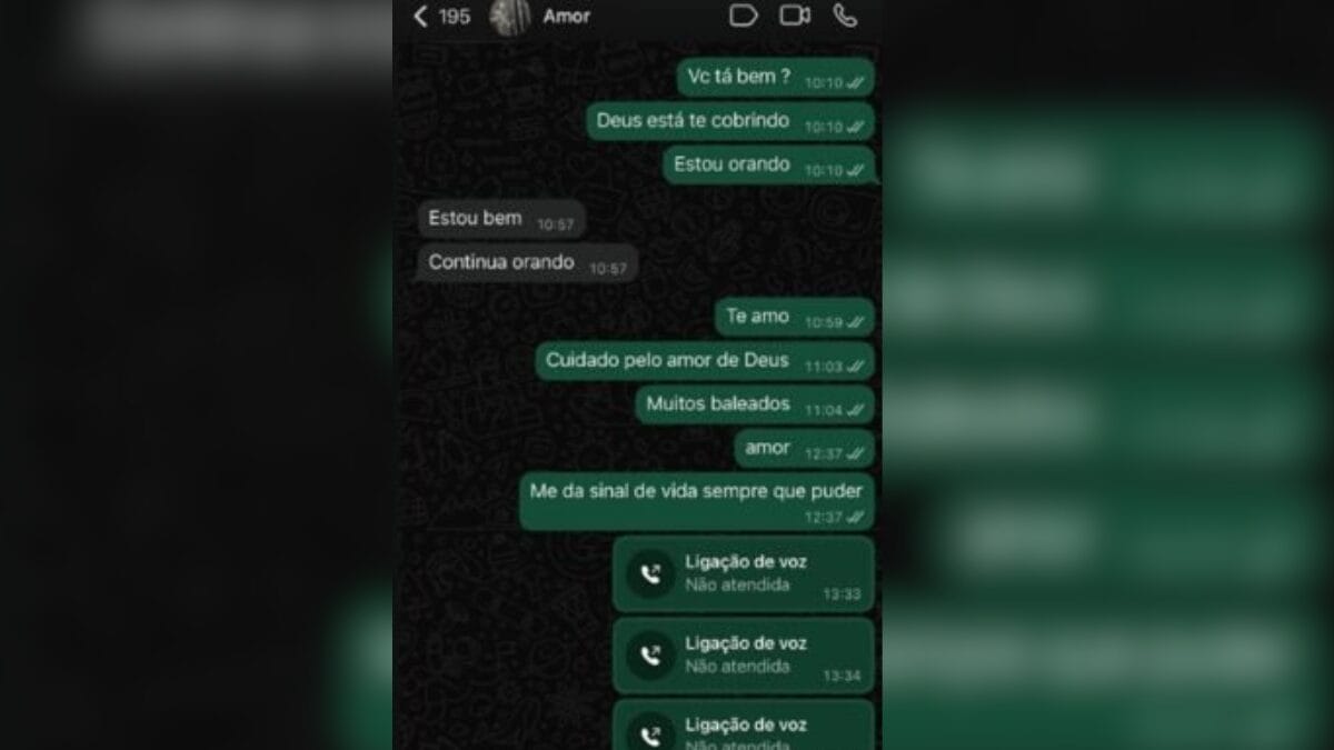 “Vc tá bem? Deus tá te cobrindo. Estou orando”, escreve Jéssica Araújo, esposa de Heber. O sargento responde: “Estou bem. Continua orando”. Ela continua: “Te amo. Cuidado pelo amor de Deus. Muitos baleados. Amor, me da sinal de vida sempre que puder”.
