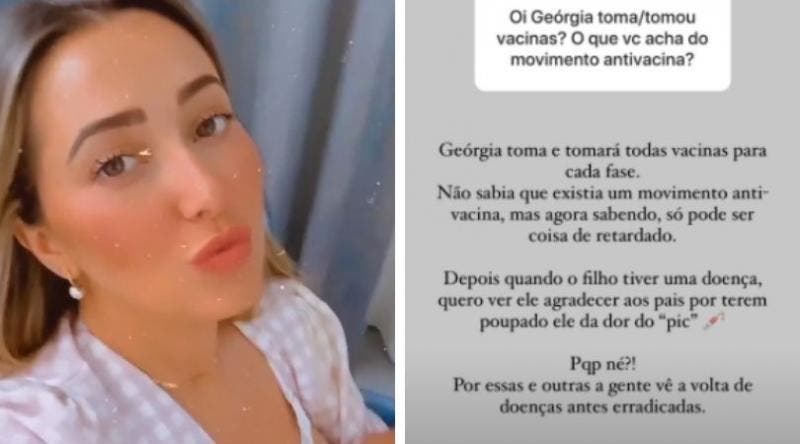 Resposta: “Geórgia toma e tomará todas vacinas para cada fase. Não sabia que existia um movimento antivacina, mas agora sabendo, só pode ser coisa de retardado. Depois quando o filho tiver uma doença, quero ver ele agradecer aos pais por terem poupado ele da dor do ‘pic’. Pqp né?! Por essas e outras a gente vê a volta de doenças antes erradicadas”.