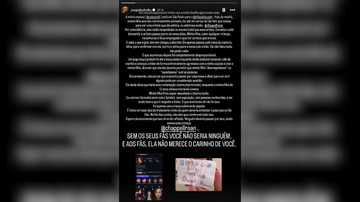 Segundo post feito nas redes sociais de Jorginho, a enteada dele de 11 anos e sua esposa, Catherine Harding, teriam sido aboradas de maneira “extremamente agressiva” pelo segurança de Chappell Roan durante o café da manhã em um hotel de São Paulo, onde a americana casualmente estava hospedada. As duas estavam na cidade justamente para assistir ao show de Chappell no Lollapalooza.