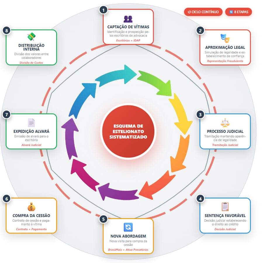 De acordo com o MP, o esquema operava por meio de empresas de fachada que adquiriam créditos judiciais de idosos por valores irrisórios. As vítimas, que têm idade média de 69 anos, eram abordadas em casa ou por meio do site do Instituto de Defesa do Aposentado e Pensionista (IDAP), e induzidas a assinar contratos de cessão de crédito. Integrantes do esquema levavam as pessoas a cartórios para reconhecimento de firma, visando dar aparência de credibilidade à negociação.