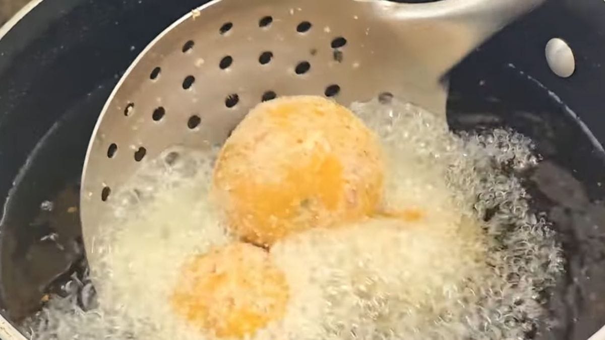 Utilize farinha de rosca para empanar. Primeiro mergulhe as bolinhas na água e em seguida derrame farinha de rosca por cima das bolinhas. Leve para fritar em óleo quente. Sirva como preferir.