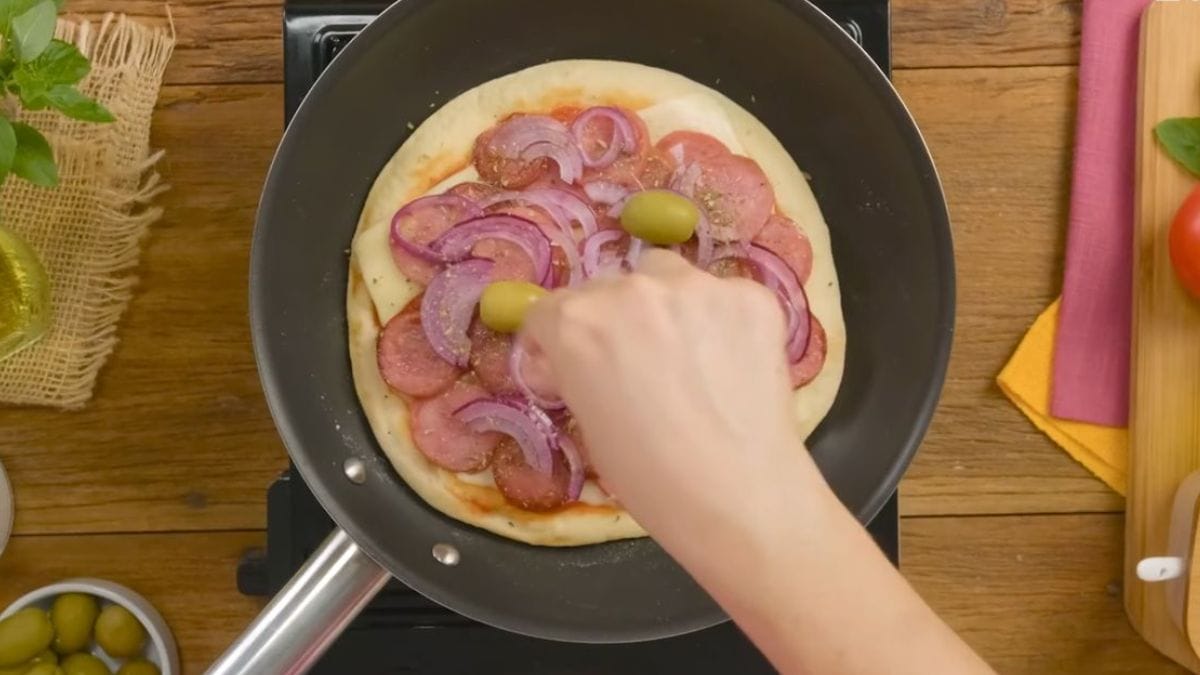 - Azeite para dourar a pizza na frigideira.