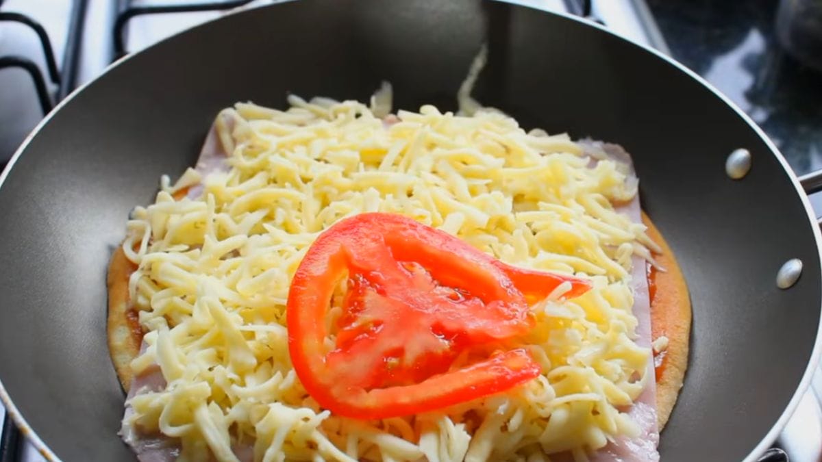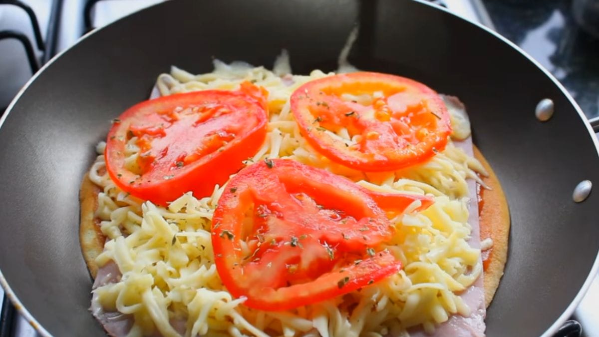 Acrescente o recheio da sua preferência. No vídeo, a cozinheira sugere acrescentar molho de tomate, presunto, queijo ralado, tomate e orégano. Deixe cozinhar por mais alguns minutos e sirva.