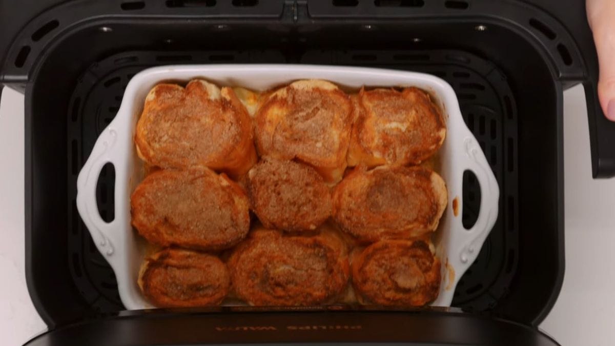 Agora, umedeça cada fatia com uma concha, deixando o líquido no fundo sem cobrir totalmente para evitar textura de pudim. Depois, polvilhe a mistura de açúcar e canela por cima para crocância.