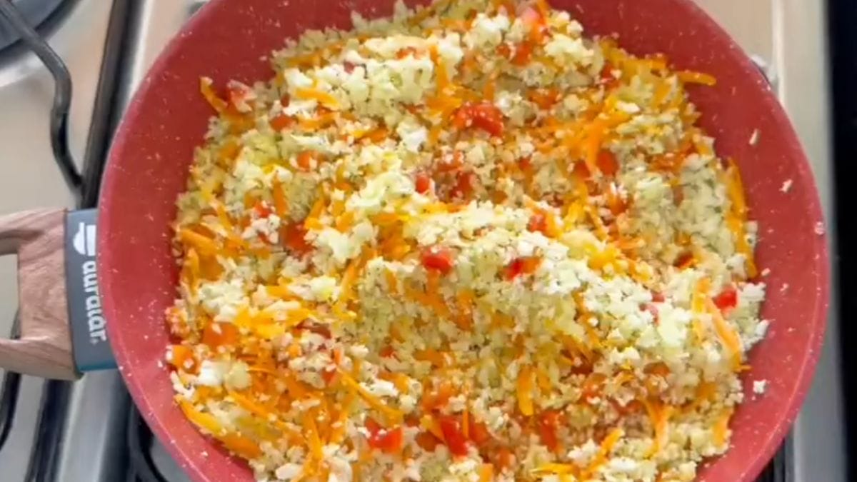 Primeiro, coloque um pouco de azeite, os dois dentes de alho e a cebola ralada em uma frigideira. Em seguida, misture. Acrescente a cenoura, o pimentão e a couve-flor triturada. Em seguida, acrescente a água e deixe cozinhar.