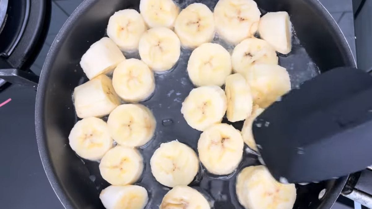 Agora, corte pequenas rodelas das bananas e coloque em uma frigideira com água em fogo baixo. Misture devagar e deixe fritar por cinco minutos.