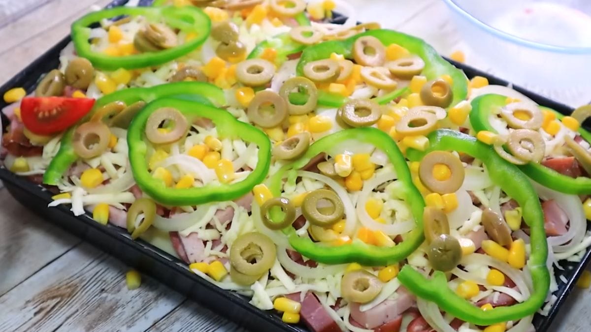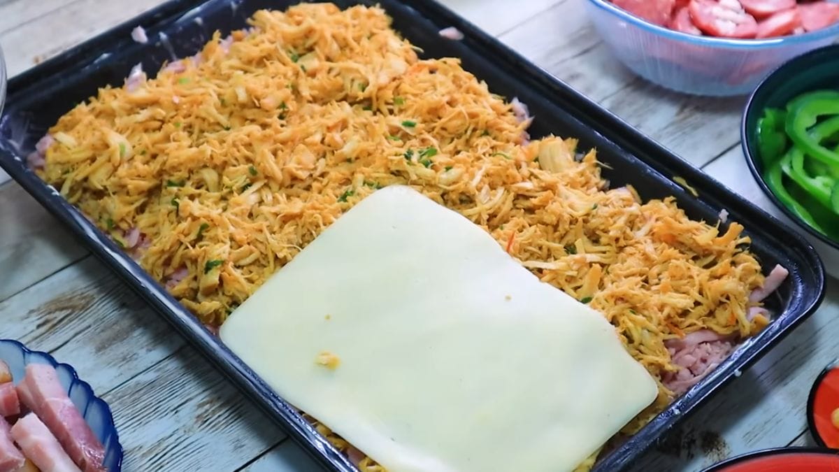 Agora, distribua camadas alternadas com o presunto ralado, frango desfiado, muçarela ralada, fatias de calabresa, bacon em cubos, mais muçarela, vegetais (cebola, pimentão, milho, azeitonas, tomate) e finalize com orégano.