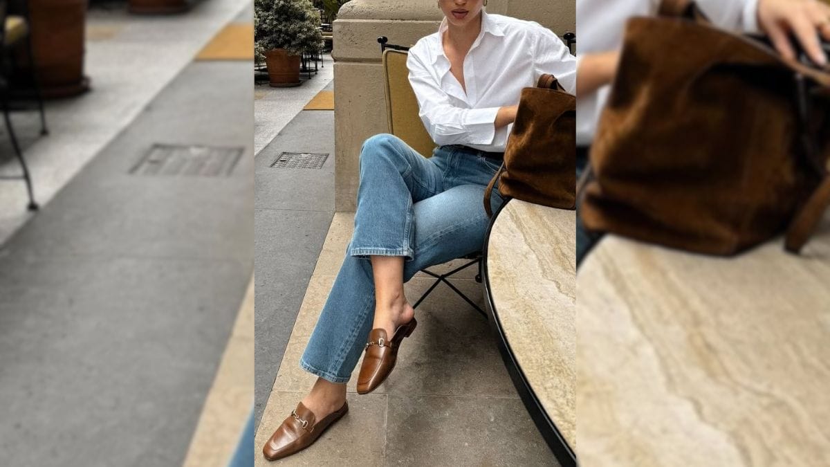 O duo básico entre um jeans e um suéter ganha destaque com a adição de um mule com salto. O calçado deixa o resultado mais polido, sem precisar mexer no restante da produção, de acordo com a Elle.
