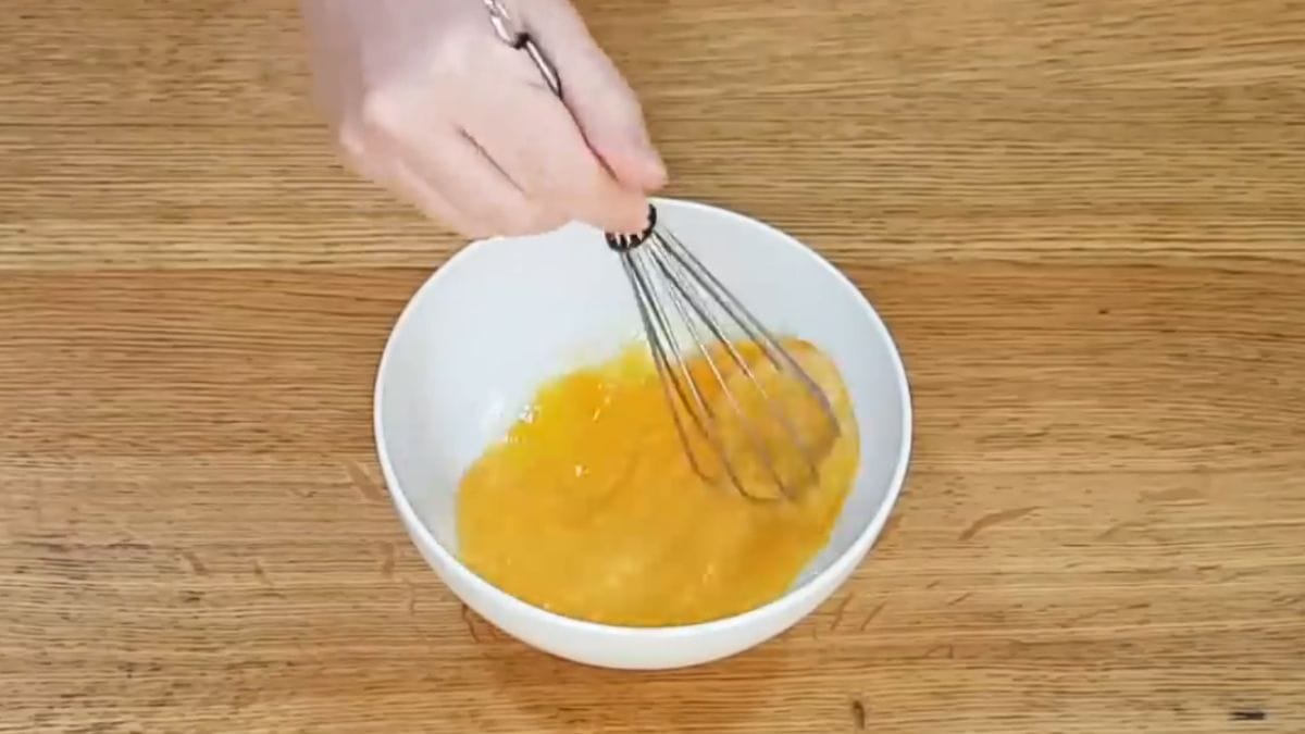 Primeiro, misture os ovos e o óleo de coco em um recipiente. Em seguida, acrescente o adoçante da sua preferência.