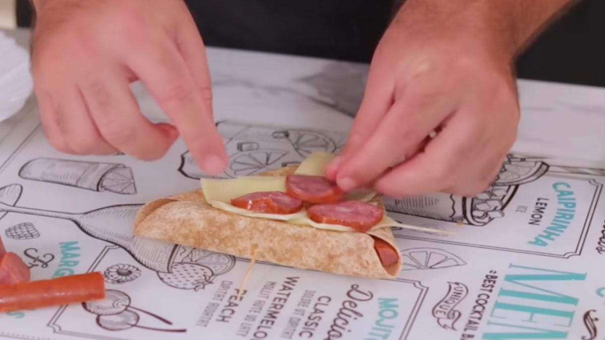 Em seguida, enrole três linguiças em um rap, formando um triângulo (veja preparo no vídeo). Agora, acrescente o molho de tomate, o requeijão cremoso, o queijo e mais algumas rodelas de calabresa. No vídeo, o cozinheiro ensina outra sugestão de recheio.