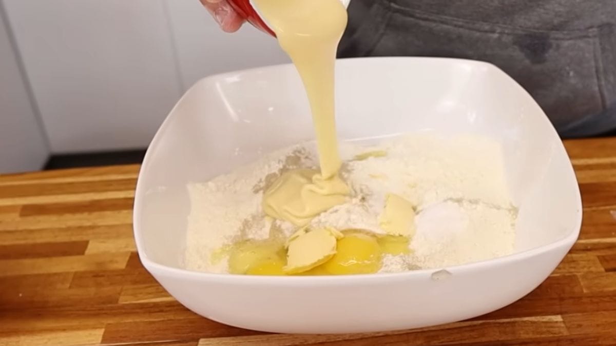 - Primeiro, em uma tigela, coloque a farinha, o fermento, os ovos, a margarina (ou manteiga), o sal e o leite condensado;