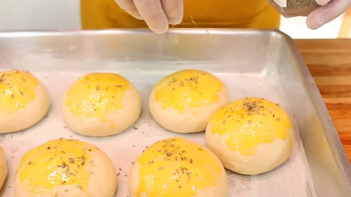 Pincele com gema de ovo algumas bolinhas; em outras, espalhe queijo ou orégano por cima para versões diferentes. Leve ao forno preaquecido a 180 °C por cerca de 20–25 minutos.