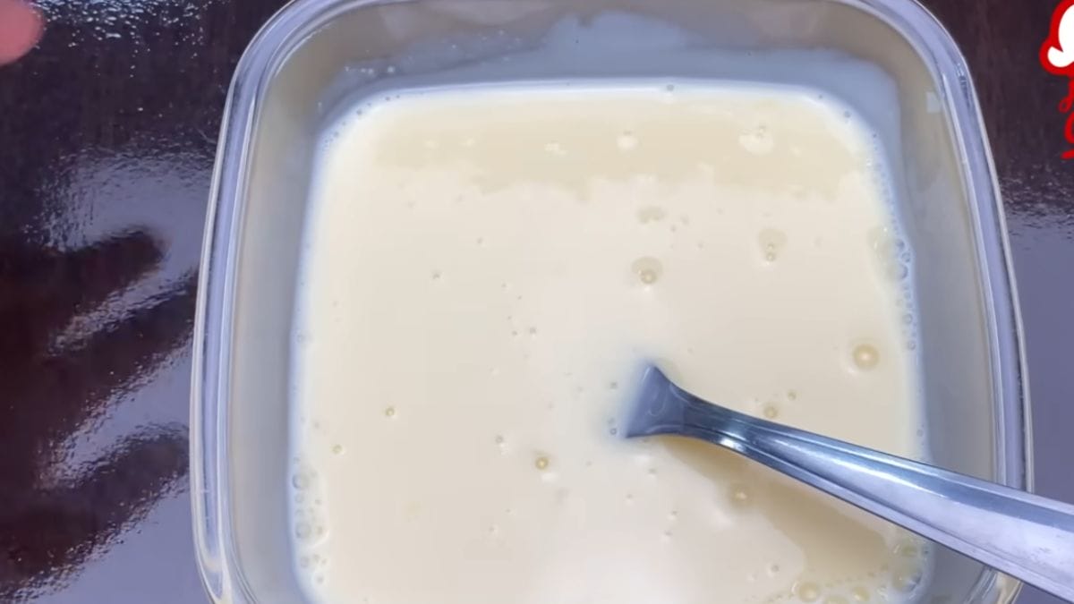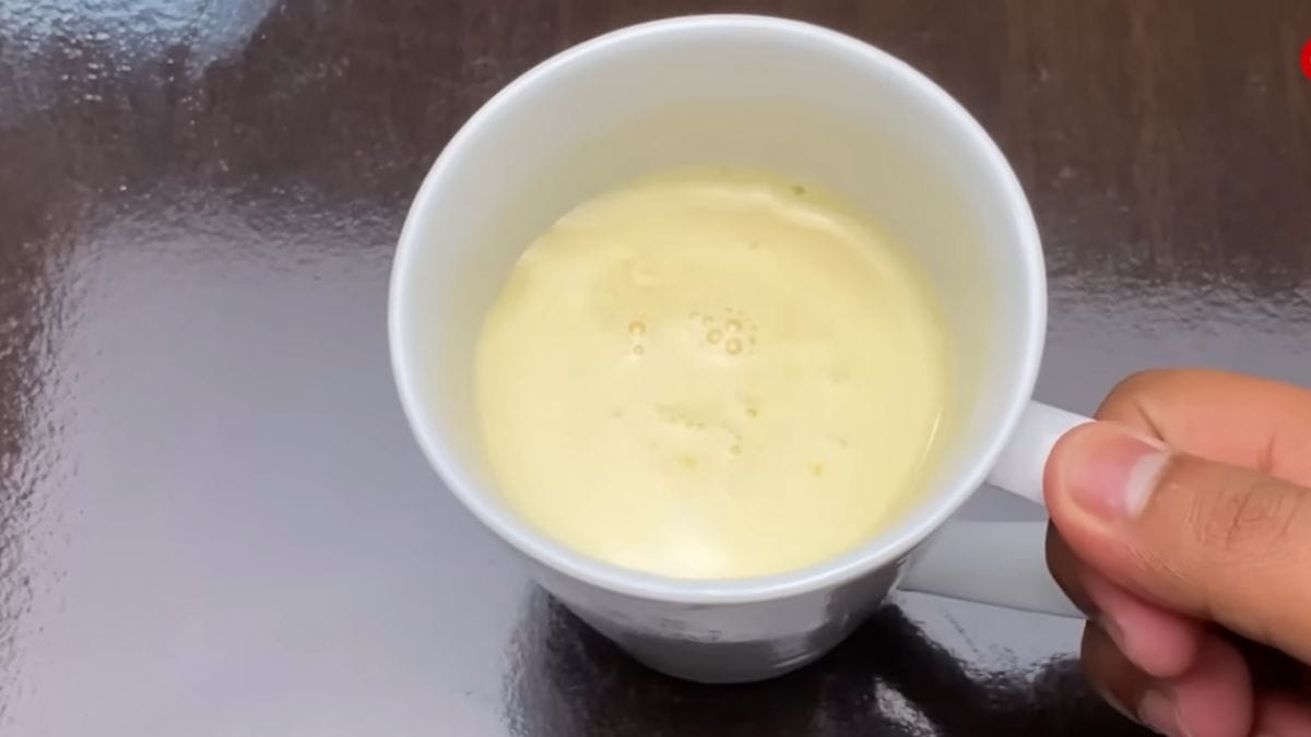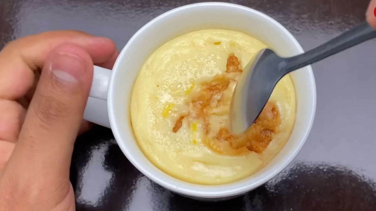 Espalhe o caramelo pelo fundo e pelas laterais da caneca. Em outro recipiente, bata o ovo com o leite e o leite condensado usando um garfo até ficar homogêneo.
