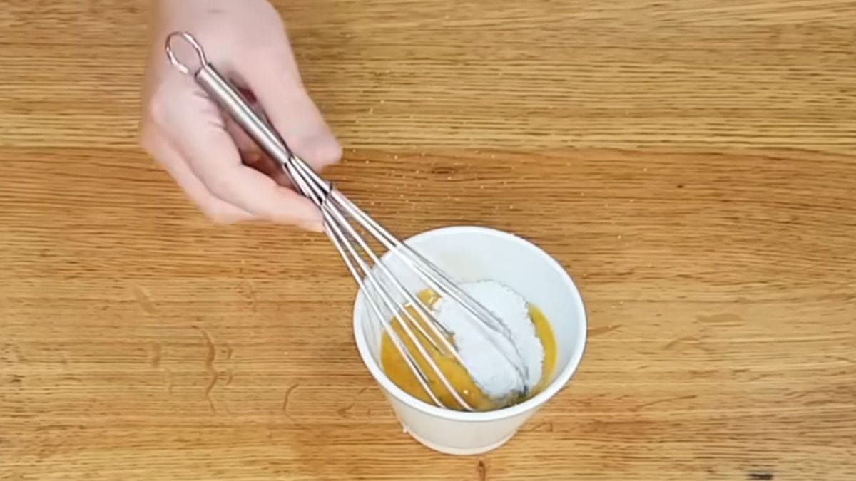 Primeiro, bata o ovo em um recipiente e misture a baunilha. Agora, acrescente o adoçante culinário e leve tudo para outro recipiente com a farinha de amendoim.