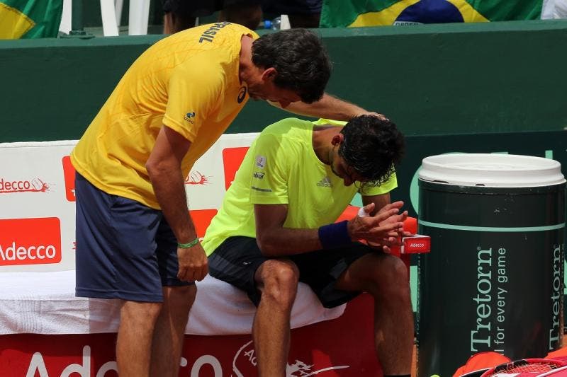 O tenista número um do Brasil desistiu da partida contra Borna Coric no quarto set, mas antes disso ele já sofria com as dores e conversava com o capitão brasileiro João Zwetsch.