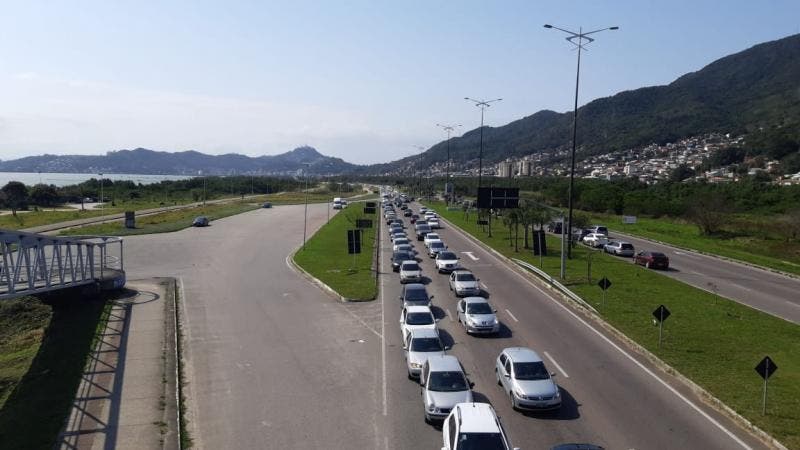 A tarde de domingo continua registrando congestionamento no acesso ao novo terminal do aeroporto de Florianópolis e à Base Aérea.